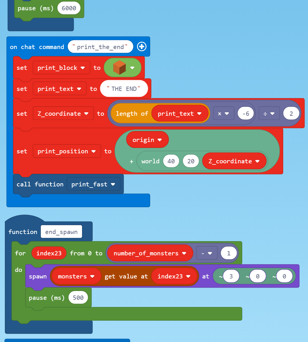 End Code Previous Next Share this:TweetLike this:Like Loading... September 20, 2018 1081 × 1708 in Monster Showtime in MakeCode for Minecraft
